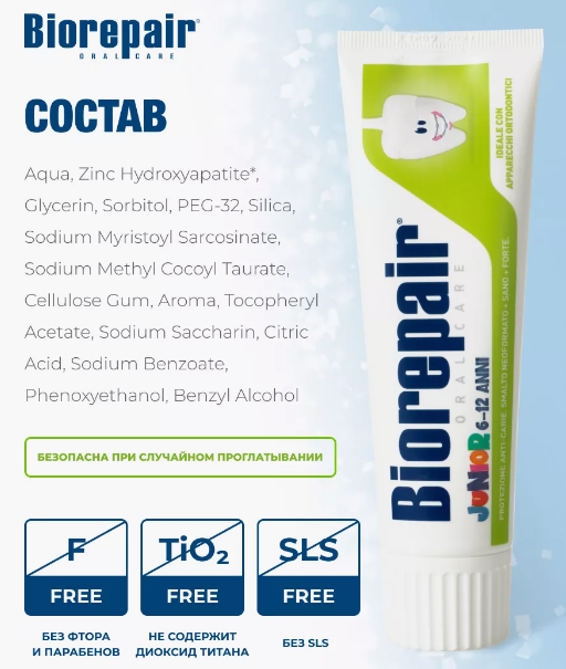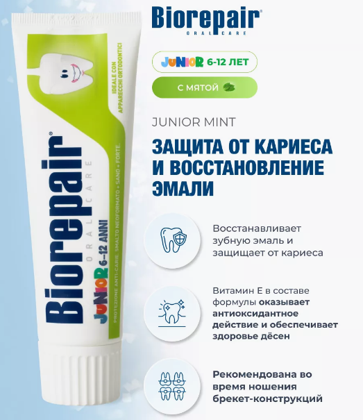 Биорепей/Biorepair Зубная паста Junior 6-12 со вкусом сладкой мяты 75мл.