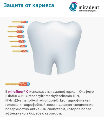 Способна оказывать анти-гликолитическое воздействие на зубной налет и обеспечивать депонирование фторидов на эмали.