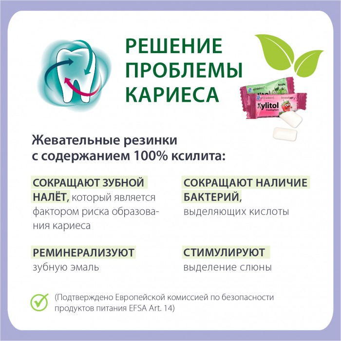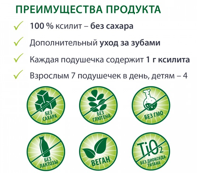 Рекомендация: жевать сразу после еды от 1 - 2 минуты по 3-4 подушечек в день для детей и 5-7 подушечек для взрослых.