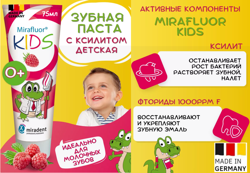 Мирадент зубная паста Mirafluor Kids, малина (0-6 лет), 75 мл 630224 | Купить в интернет-магазине "Мастер Фарм"