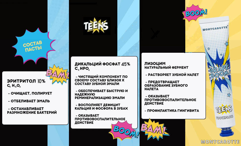 - Подойдет во время ортодонтического лечения - будет обеспечивать качественную гигиену полости рта. Зубная паста имеет сочный вкус винограда