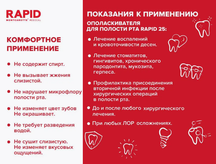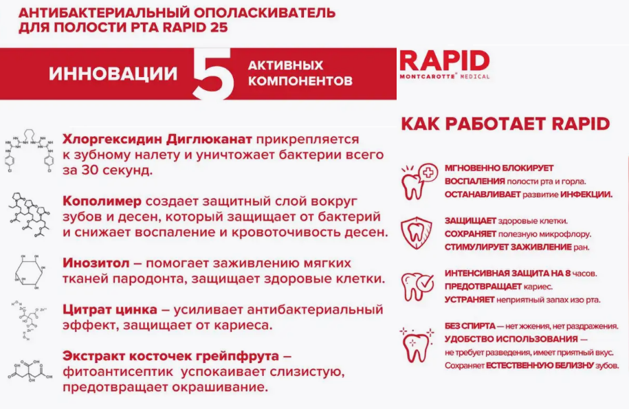 Серия Rapid не изменяется вкусовые ощущения. Не вызывает жжения и раздражения слизистой. Не содержит спирт, триклозан и ментол, что исключает микроожоги слизистой. Не содержит SLS, не изменяет естественный цвет зубов.
