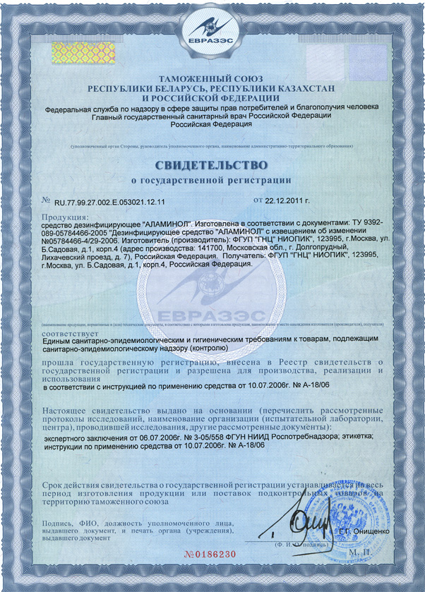 Состав: 8% глиоксаля, 5% алкилдиметилбензиламмоний хлорида (ЧАС), поверхностно-активное вещество, вода и краситель.