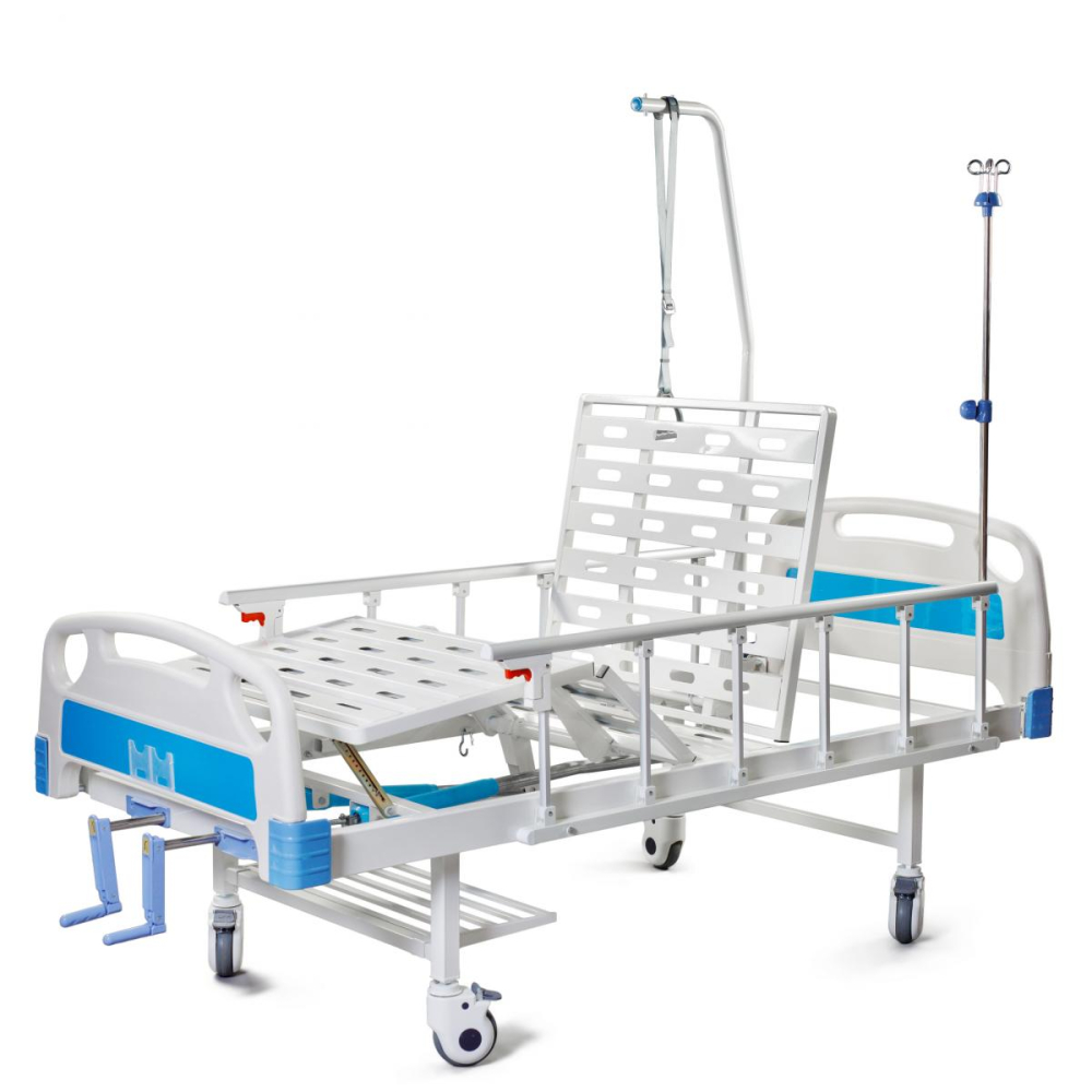 Кровать оборудована механическим приводом, самоориентирующимися колесами, карманом для мед.карты пациента и стойкой для подтягивания.