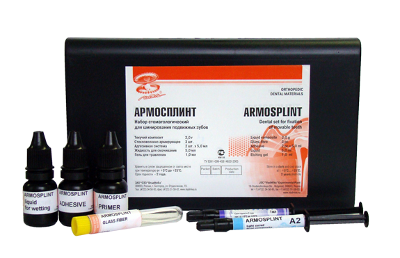 В набор «Армосплинт» входят: стекловолокно, жидкость для смачивания стекловолокна, текучий композит, адгезивная система.