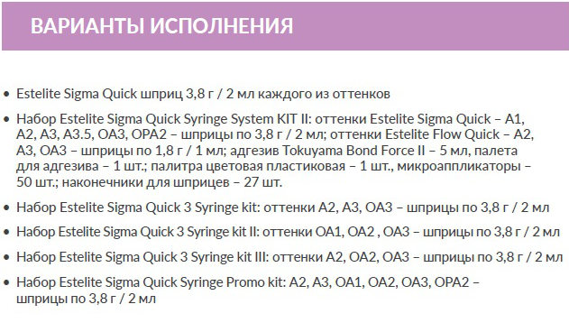 2. Композиты Estelite Sigma Quick в шприцах ( А1, А2, А3, А3,5, ОА3, ОРА2E )