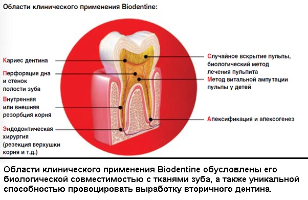 - Стимулирует образование заместительного дентина.