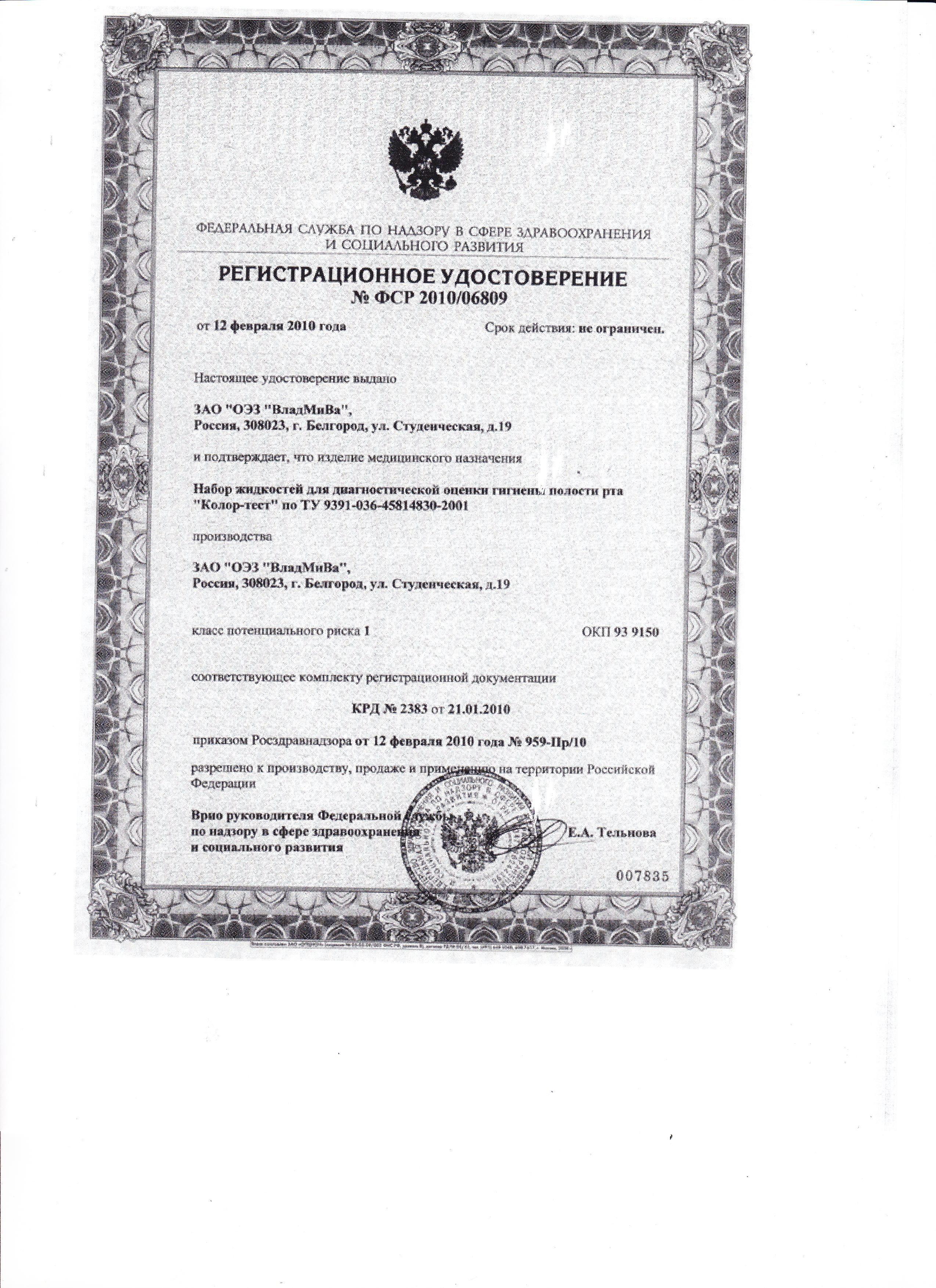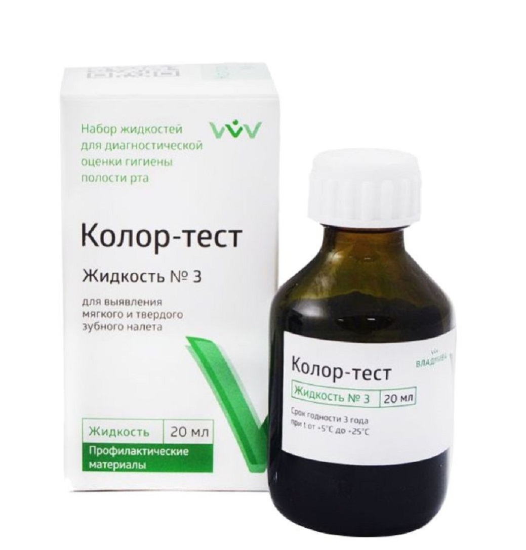 Колор-тест №3 содержит метиленовую синь, окрашивает бактериальный зубной налет в синий цвет, не изменяя цвета интактных твердых тканей и слизистой оболочки полости рта.