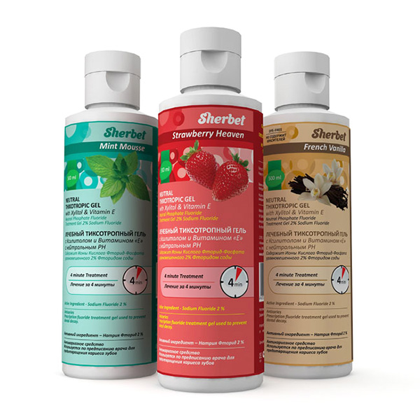 АПФ-составы чрезвычайно эффективны за счет закисленности, ионы фтора действуют быстрее, проникают глубже, запечатывая дентинные канальцы и снижая проницаемость эмали для раздражителей и патогенных микроорганизмов, вызывающих образование кариеса. Обладает свойством тиксотропности – предотвращает затекание материала в гортань. Sherbet уникален благодаря содержанию ксилита, который снижает адгезию бактерий к поверхности зуба, содержанию витамина Е, обеспечивающего эффект антиоксиданта и десенсибилизатора, а также не содержит алкоголь, глютен, соевое молоко, яйца, лесные, земляные орехи! Все ароматизаторы в нашей продукции только натурального происхождения!