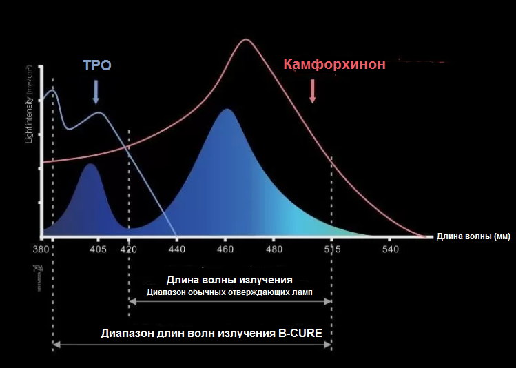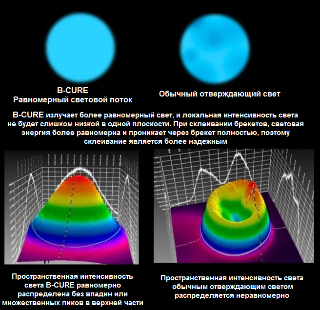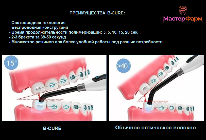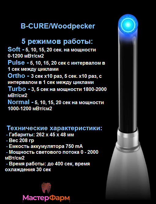 Наделена светодиодом широкого спектра ( длина волны - 385-515 нм ), за счет которого возможно применение B-CURE в ортодонтической, терапевтической и ортопедической стоматологии.