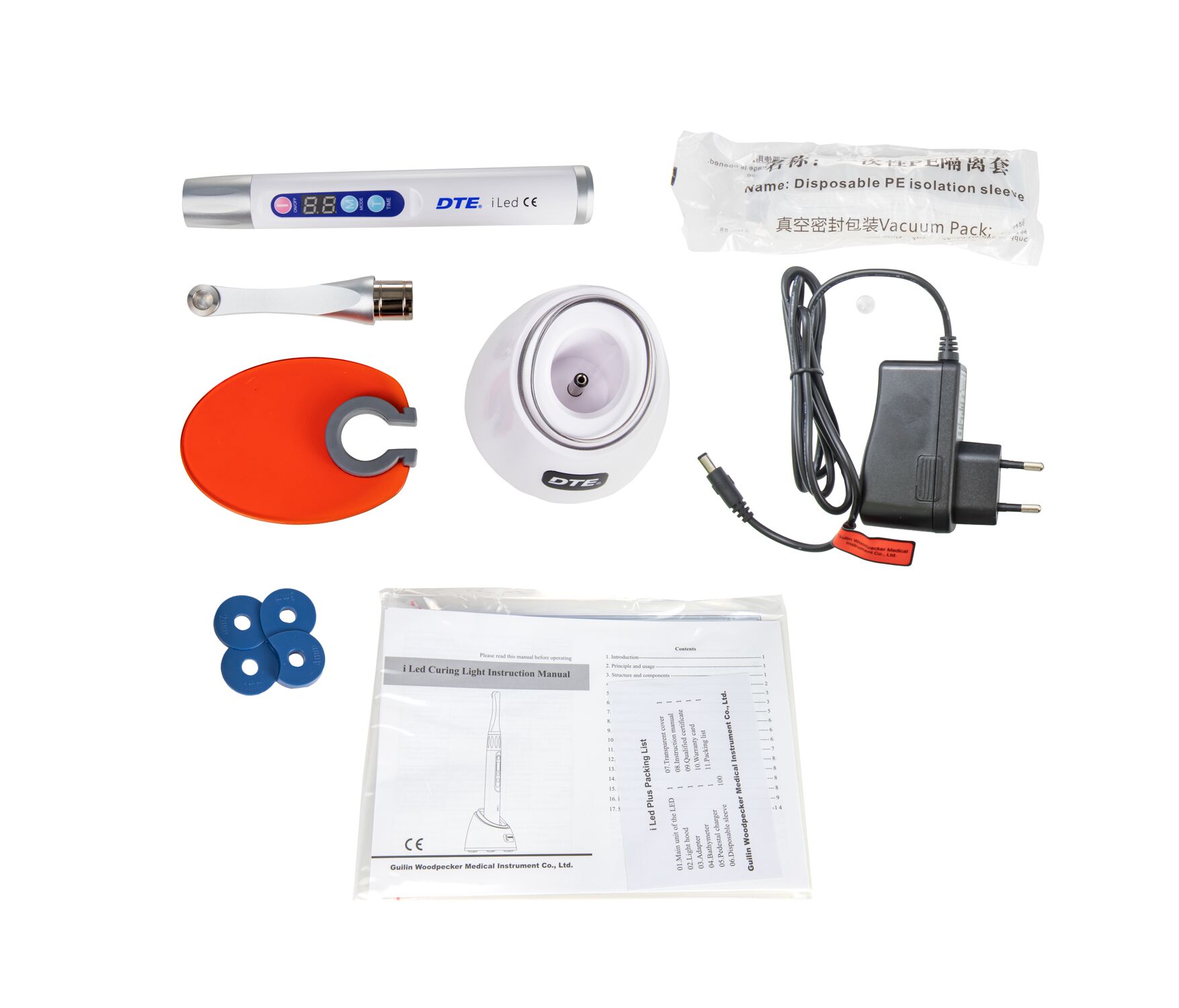 В комплектацию входят: фотополимерная лампа, защитное стекло, световод, встроенный аккумулятор, зарядное устройство совместно со станцией и инструкция по применению.