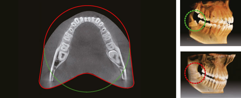 Инновационное поле обзора компьютерном томографе Green Smart обеспечивает захват объема в форме зубной дуги, что обеспечивает попадание более широкой зоны интереса по сравнению с другими аппаратами с аналогичными по размеру полями обзора. Обычно, поле обзора 10x8,5 достаточно для визуализации 8-х зубов. В случае ретенированных 3-х моляров высока вероятность того, что корни зуба могут быть срезаны. "Арочный объем" исключает такую вероятность, демонстрируя скрытую область зубного ряда.