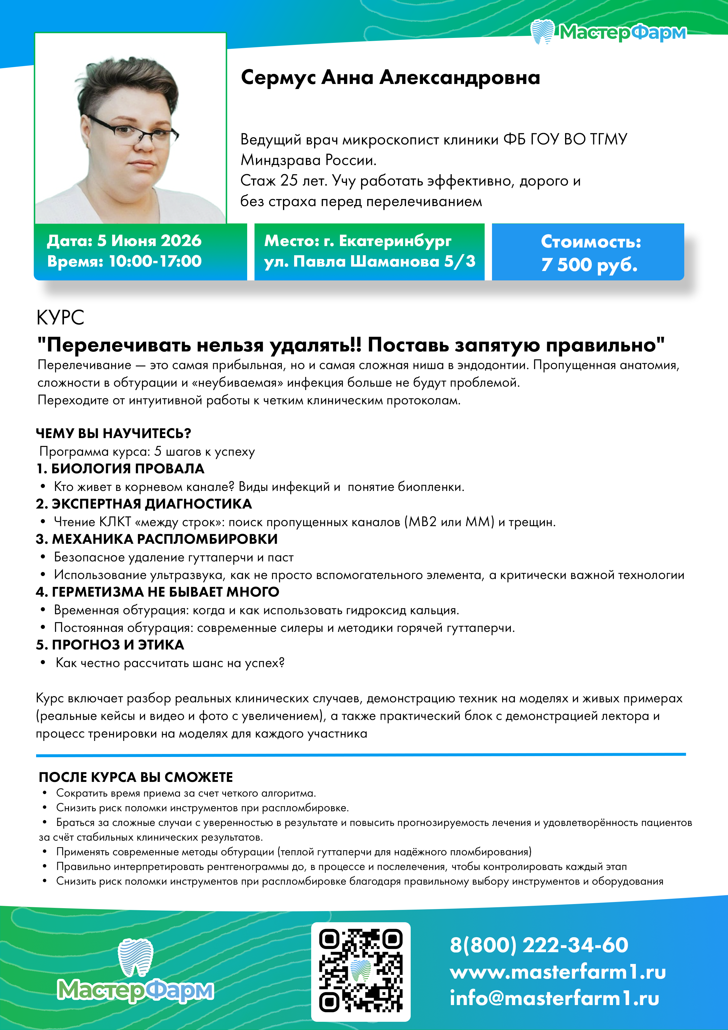 Компания «Мастер Фарм» приглашает вас на уникальный однодневный интенсив в Екатеринбурге, который изменит ваш взгляд на самую сложную и самую прибыльную нишу в эндодонтии. Мы не будем рассуждать — мы дадим вам четкие протоколы для действия.