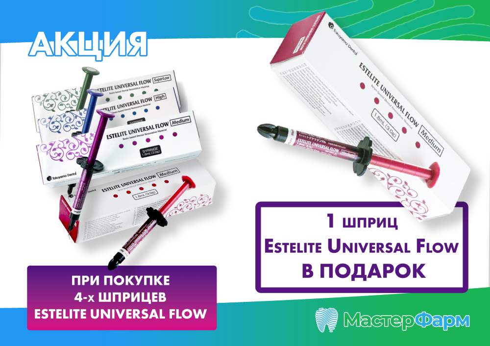 При заказе четырех шприцев Estelite Universal Flow, пятый шприц вы получаете в подарок! Это отличная возможность сделать запас основного рабочего материала на несколько месяцев вперед с существенной экономией.