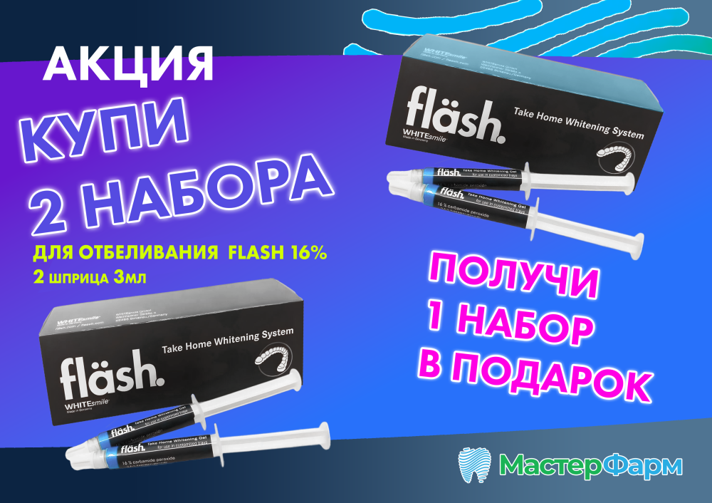 Коллеги, компания «Мастер Фарм» подготовила для вас выгодное предложение на профессиональную систему отбеливания FLASH 16% — идеальный выбор для кабинетного осветления зубов.